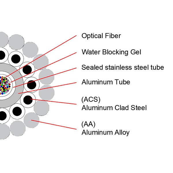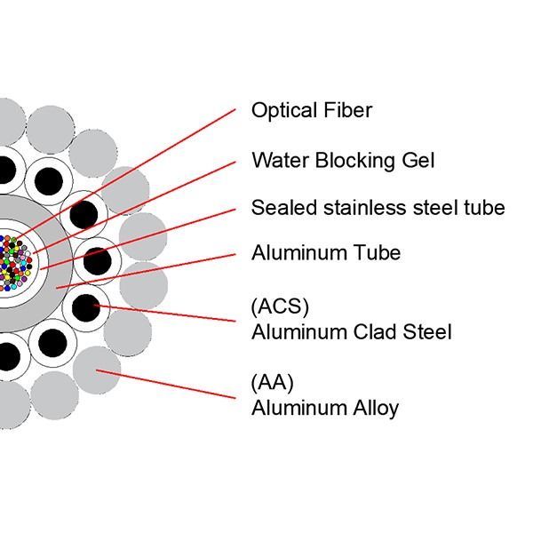 De geslagen optische aarddraad is gemaakt van twee of drie lagen aluminium-beklede stalen (ACS) draden, of een combinatie van ACS en aluminiumlegering draden, die mechanische sterkte, duurzaamheid en elektrische prestaties bieden. Het standaardontwerp heeft een centrale roestvrijstalen buis met daarin de glasvezels, bedekt met aluminium voor extra bescherming.